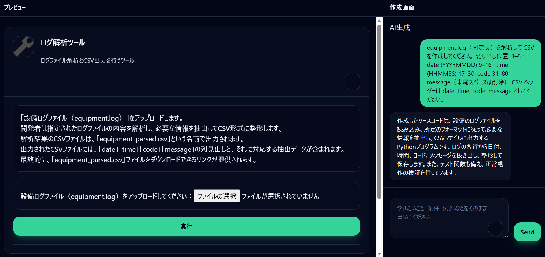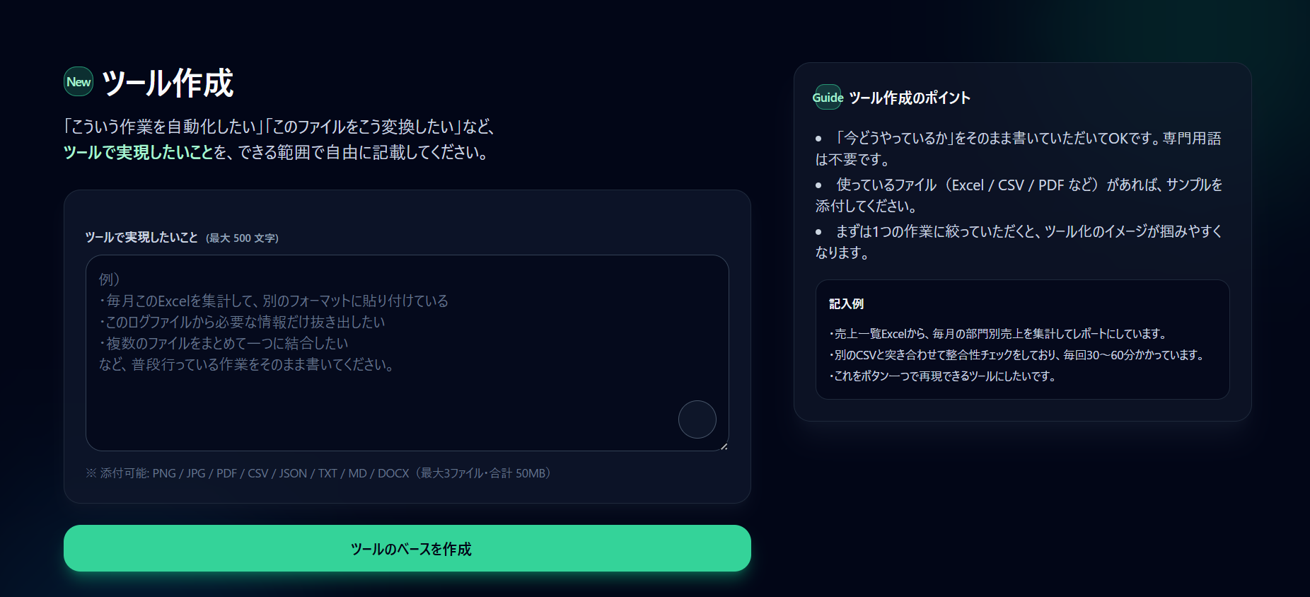サンプルファイルと作業フローをもとに、AIが処理ロジックを生成し、 入力/出力が決まった “実行ツール” に落とし込みます。